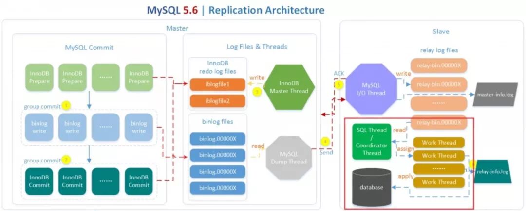 2、基于Group Commit的并行复制虽然5.6中的并行复制在大多数应用场景中对回放速度的提升不大,但是该架构却成为了后来MySQL并行复制的基础——即在Slave上并行回放RelayLog,SQL线程负责判断能否并行回放,并分配给Work线程回放。
