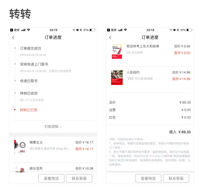 这回卖书因为都是官方渠道,转转这边其实体现了一些优势。单纯从回收书籍的业务流程上来讲,两个平台差距不大。但是用户最关心的还是尽可能回收的书多谢,回收价格高些,这个就是转转的优势。剩下产品功能啥的就显得没那么重要了,不过我还是觉得转转应该能把功能做的更好一些,至少把订单合并起来(不得不吐槽)。