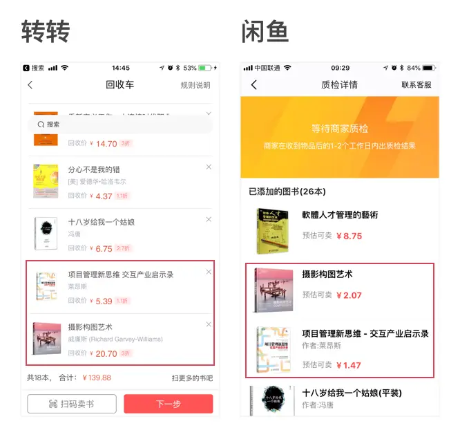 1. 可以回收的图书不同。我的52本书,转转可以录入45本,闲鱼只能录入26本。