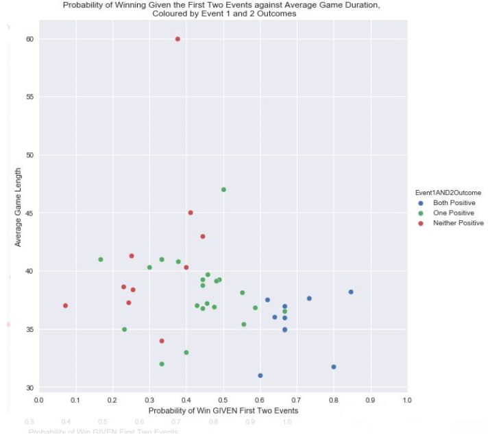 在第一部分中,我们进行了一些介绍性的统计分析。例如,假设队伍在比赛中补到第一个和第二个兵,我们能够计算出获胜的概率,如下图所示。