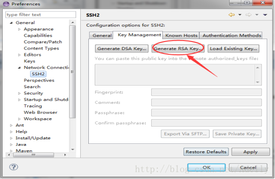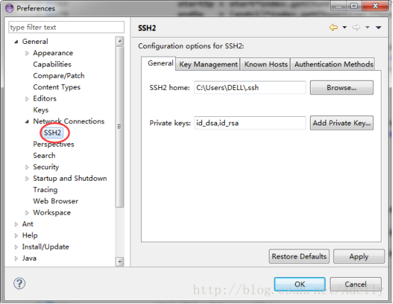 我们用的是eclipse自带的生成key的工具,windows->preferences->General->Network Connections->SSH2,点击SSH2。