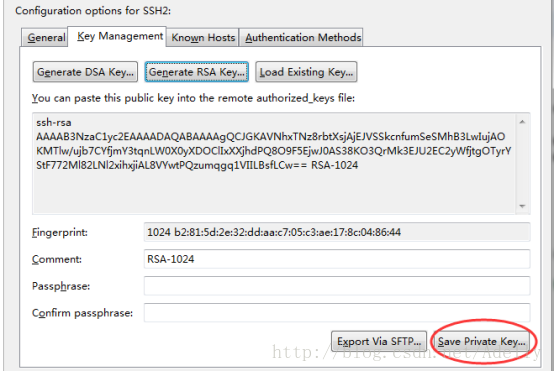 后面输入key的说明和密码,密码也可以空着。点save private key. 把生成的key文件存到用户目录的.ssh目录下。(像第一张图中SSH2 Home指定的目录)