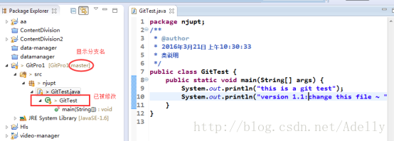当我们修改GitTest.java的时候。文件状态会发生改变