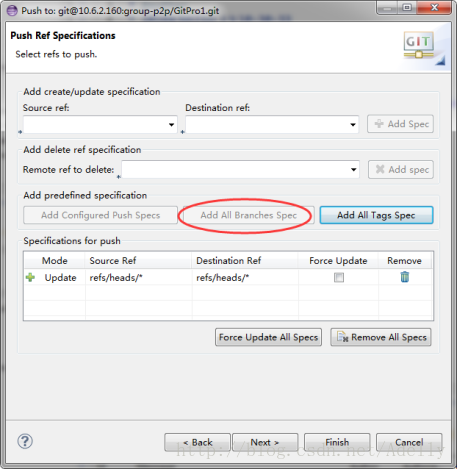 填写好后,点击next –>Add All Branches Spec->Finish.