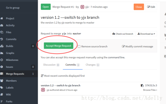 管理员任何新建分支提交的代码,审阅后没有问题的情况下点击Accept Merge Request