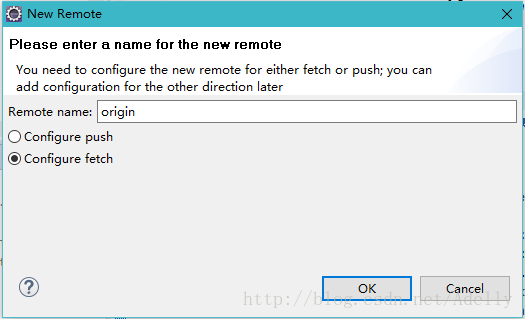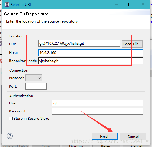 然后将服务器web端的工程URL粘贴在下图中,并填上主机地址。点finish。接下来再点击左下角的save and fetch。然后大功告成,最后一张图中我们就看到方框中远程追踪已经出现了,接下来你就可以任意的fetch远程分支了。