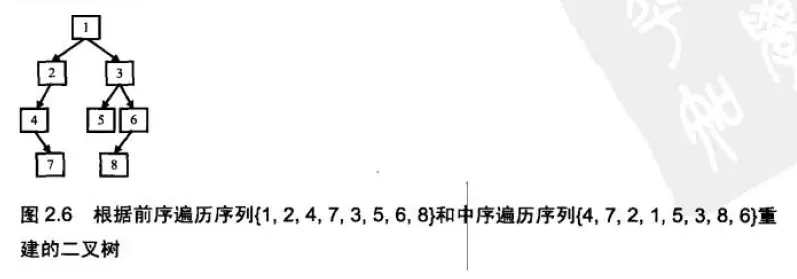 题目:输入某二叉树的前序遍历和中序遍历的结果,请重建出该二叉树。假设输入的前序遍历和中序遍历的结果中都不含重复的数字。例如:前序遍历序列{ 1, 2, 4, 7, 3, 5, 6, 8}和中序遍历序列{4, 7, 2, 1, 5, 3, 8,6},打印出它的后序遍历