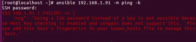 4.在我们在centos中安装完ansible时候分别对单主机进行ping操作,出现下面报错
