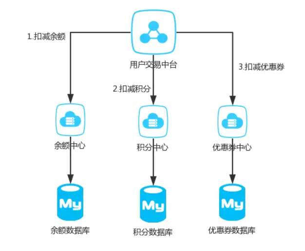 T1=扣100元 T2=给用户加一瓶水 T3=减库存一瓶水