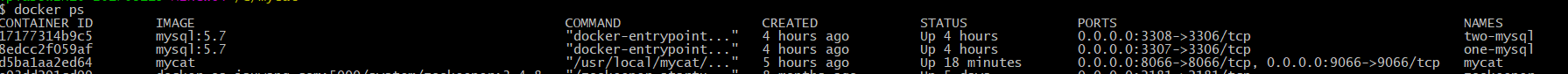 docker rm -f mycat docker run -d -v e:/mycat/conf:/usr/local/mycat/conf -d 8066:8066 -d 9066:9066 --name mycat mycat docker ps 这个时候我们就不用每次使用