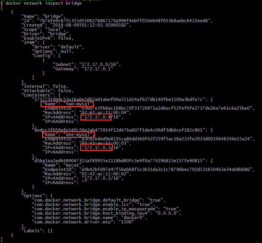 docker network inspect bridge查看