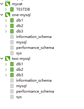 CREATE TABLE `company` ( `id` int(11) NOT NULL, `name` varchar(20) DEFAULT NULL, `age` int(11) DEFAULT '0', PRIMARY KEY (`id`) ) ENGINE=InnoDB DEFAULT CHARSET=utf8; insert into company (id,NAME,age) values (1,'jp',25); 可以看到one-mysql,two-mysql的所有db库里都有一个company表,而且每个库表里都有刚刚插入的内容, 但是这个效果看起来像是全量复制的感觉,没有很分片,这是因为schema.xml中