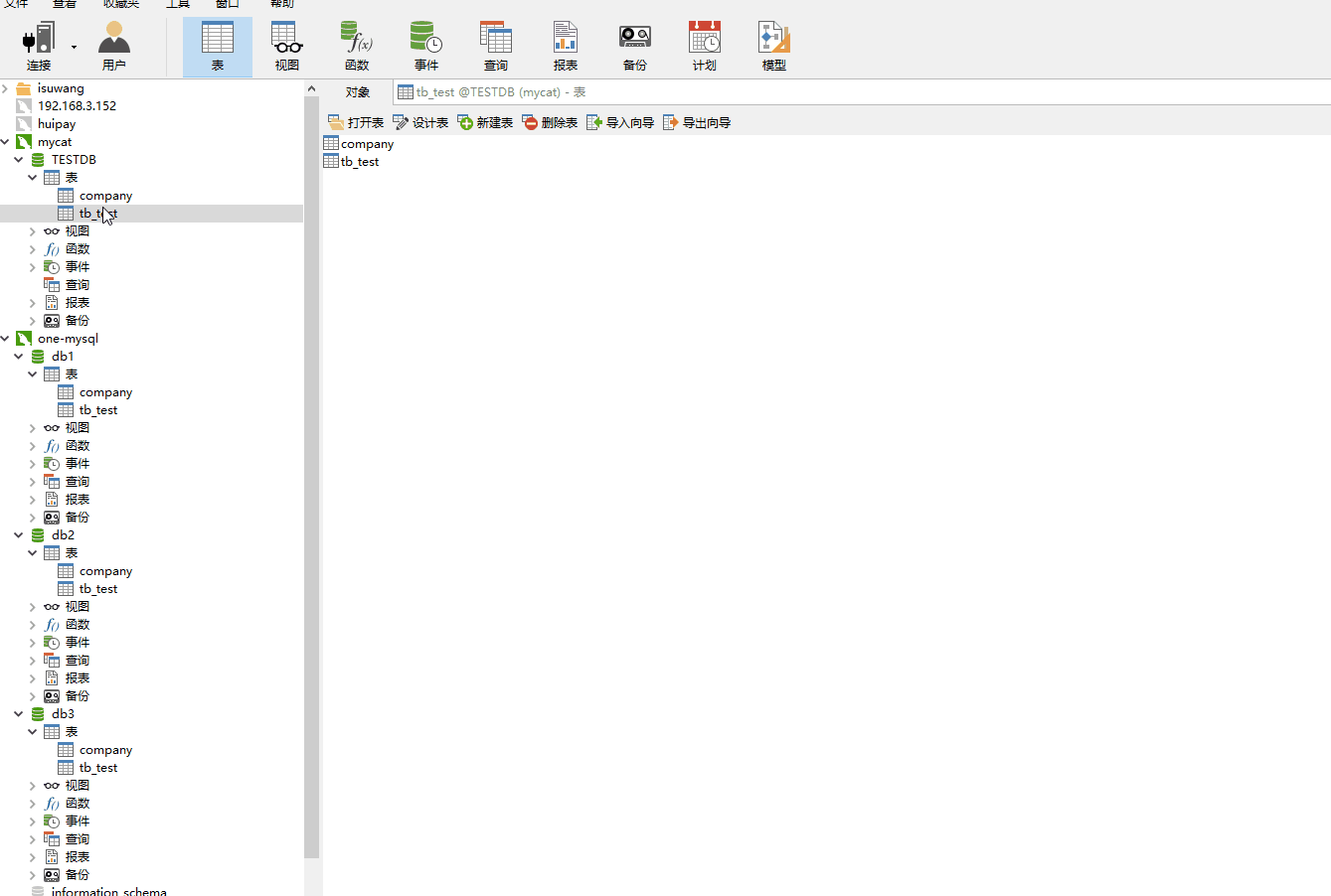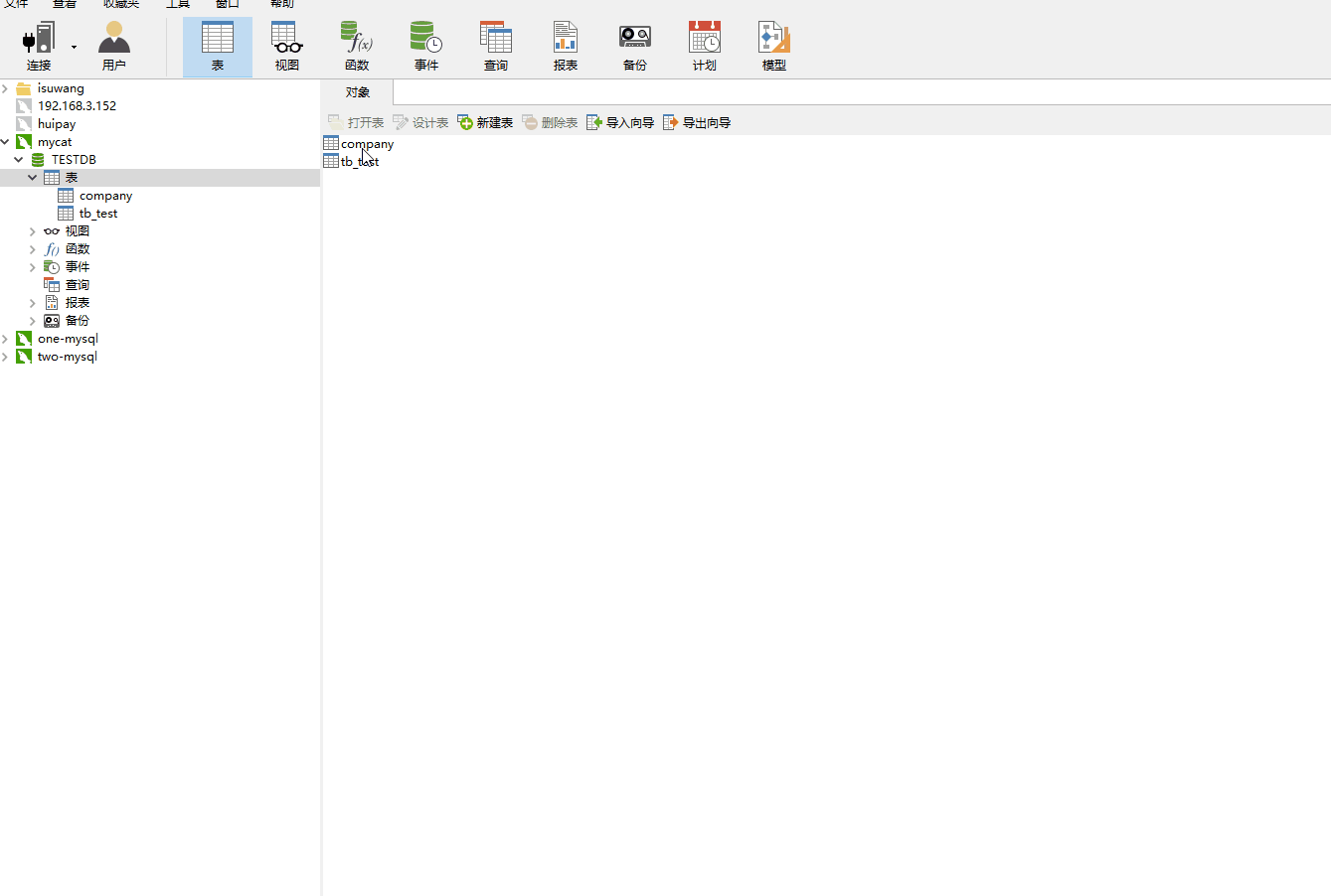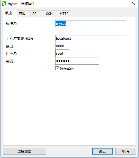 winpty docker exec -it mycat bash进入容器中去修改mycat 配置文件了,可以直接在e:/mycat/conf目录下修改保存,然后在命令行窗口执行docker restart mycat && docker attach mycat重启mycat,attach是为了在启动的时候打印日志到控制台,方便实时查看错误 - 使用navicat for mysql 连接我们刚刚创建的mycat,mysql