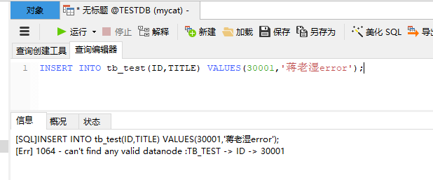 发现结果不一样了,根据id的范围区间不同,数据所在的数据库实列也不同,所在的database也不同。CREATE TABLE tb_test ( id BIGINT(20) NOT NULL, title VARCHAR(100) NOT NULL , PRIMARY KEY (id) ) ENGINE=INNODB DEFAULT CHARSET=utf8 ; INSERT INTO tb_test(ID,TITLE) VALUES(1,'蒋老湿1'); INSERT INTO tb_test(ID,TITLE) VALUES(6000,'蒋老湿2'); INSERT INTO tb_test(ID,TITLE) VALUES(10001,'蒋老湿3'); INSERT INTO tb_test(ID,TITLE) VALUES(15001,'蒋老湿4'); INSERT INTO tb_test(ID,TITLE) VALUES(20001,'蒋老湿5'); INSERT INTO tb_test(ID,TITLE) VALUES(25001,'蒋老湿6'); INSERT INTO tb_test(ID,TITLE) VALUES(30001,'蒋老湿error'); 超出id最大值则会有如下错误!因为我们规则中定义的最大id范围为30K = 30000