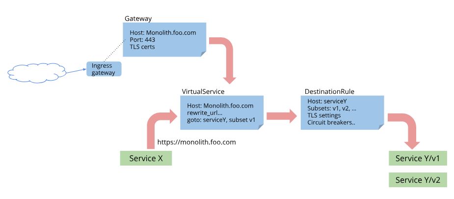 请注意,在此配置中,来自网格中其他服务的内部请求不受这些规则约束,而是简单地默认为循环路由。要将这些(或其他规则)应用于内部调用,我们可以将特殊值 mesh 添加到 gateways 的列表中。