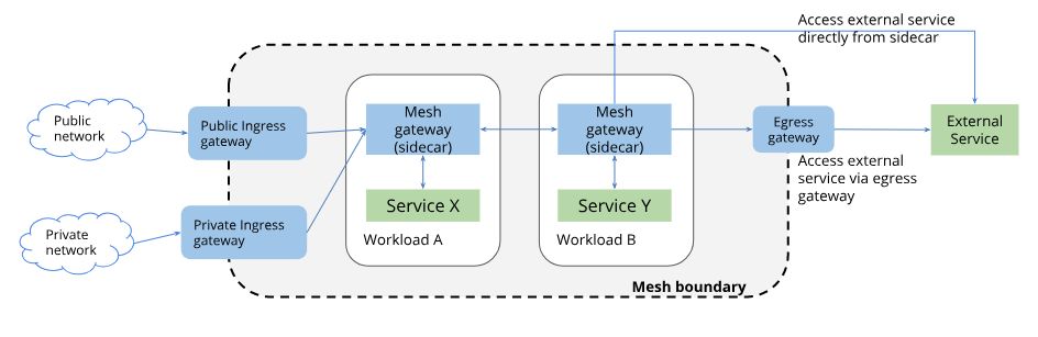 在一个典型的网格中,通常有一个或多个用于终结外部 TLS 链接,将流量引入网格的负载均衡器(我们称之为 gateway)。 然后流量通过边车网关(sidecar gateway)流经内部服务。 应用程序使用外部服务的情况也很常见(例如访问 Google Maps API),一些情况下,这些外部服务可能被直接调用;但在某些部署中,网格中所有访问外部服务的流量可能被要求强制通过专用的出口网关(Egress gateway)。 下图描绘了网关在网格中的使用情况。