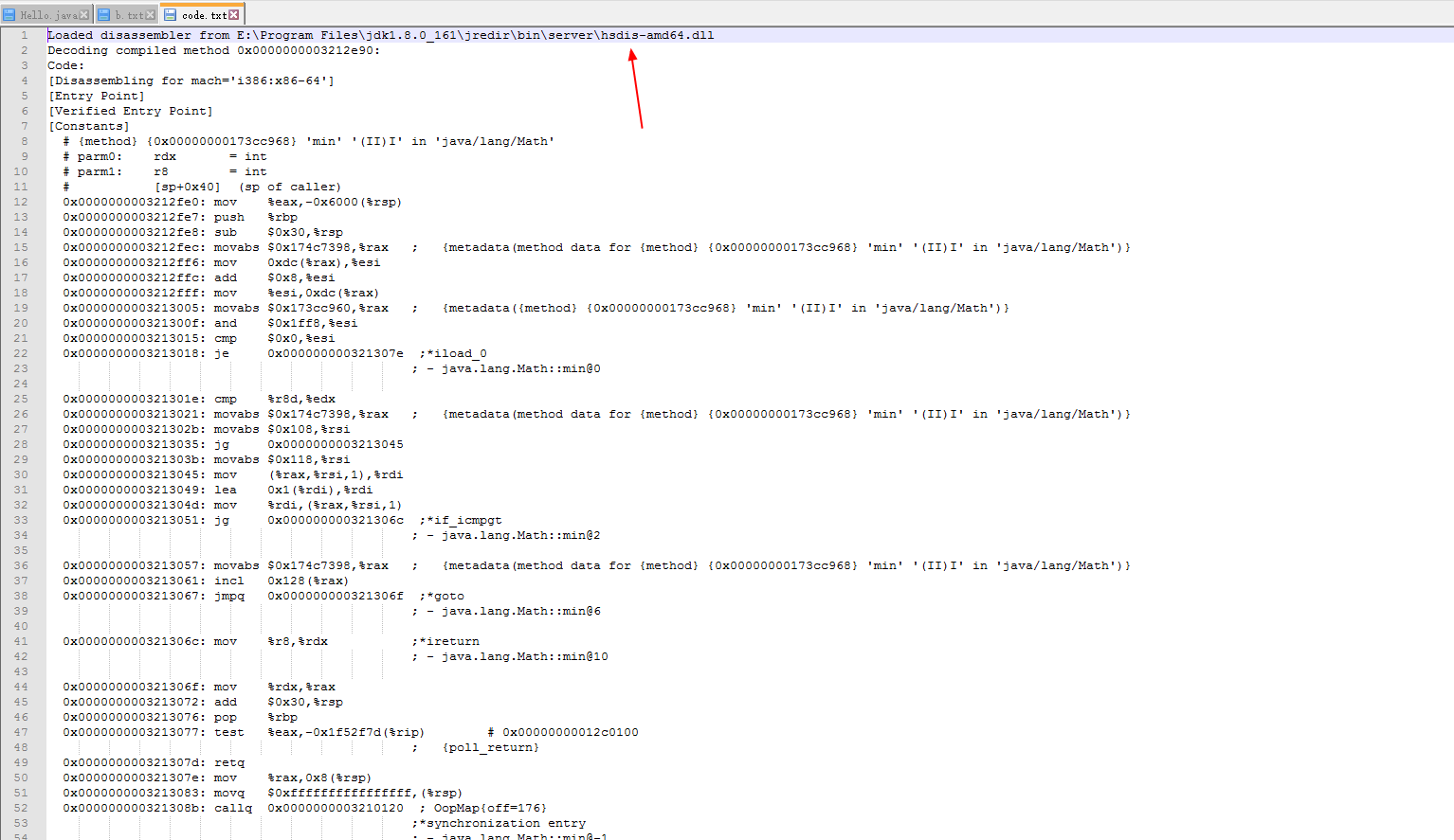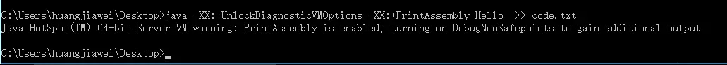 当你在命令行执行java -XX:+PrintAssembly -XX:+UnlockDiagnosticVMOptions Hello >> code.txt就会输出大量汇编代码,如下图:
