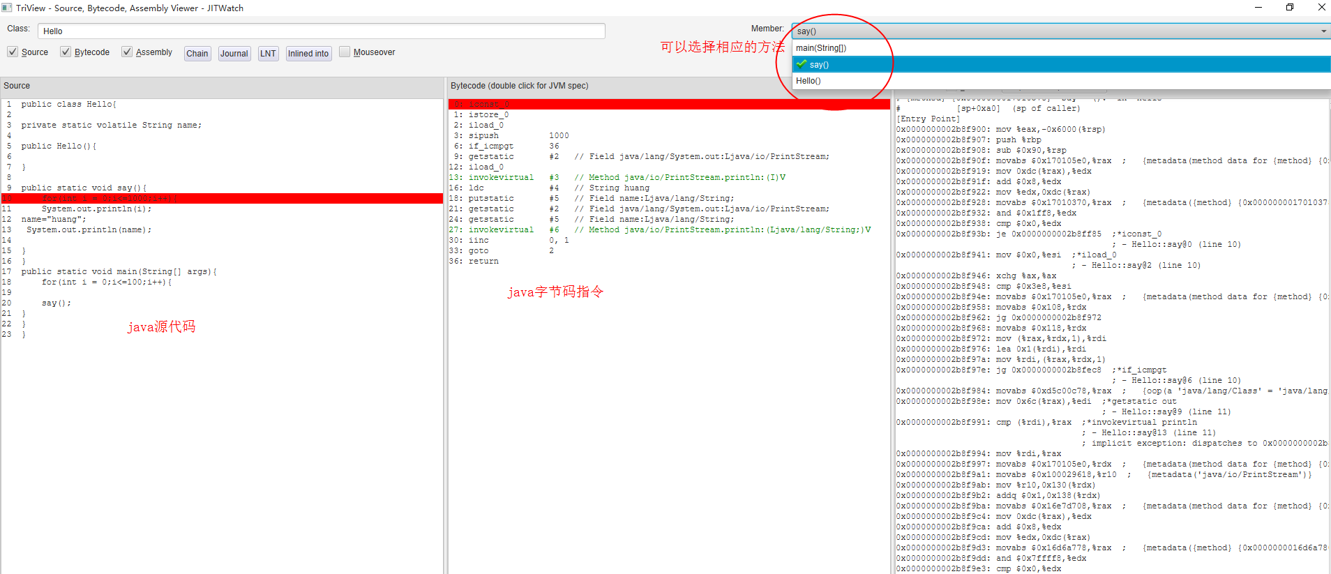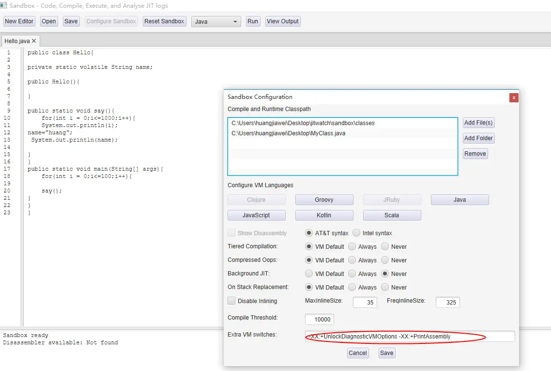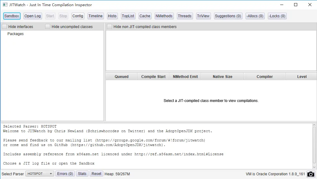 最后,如果您正在使用JDK8,那么您需要确保你写的Java方法被调用的次数足够多,以触发C1(客户端)编译,并大约10000次触发C2(服务器)编译器并打开高级优化。换句话说,你要像查看汇编代码,你写的Java源代码文件不能太过于简单,要足够复杂,但我们第一节的Hello.java已经足够了,同时jitwatch本身也提供了很多学习样例,可以在JITWatchDir\sandbox\sources中获得。