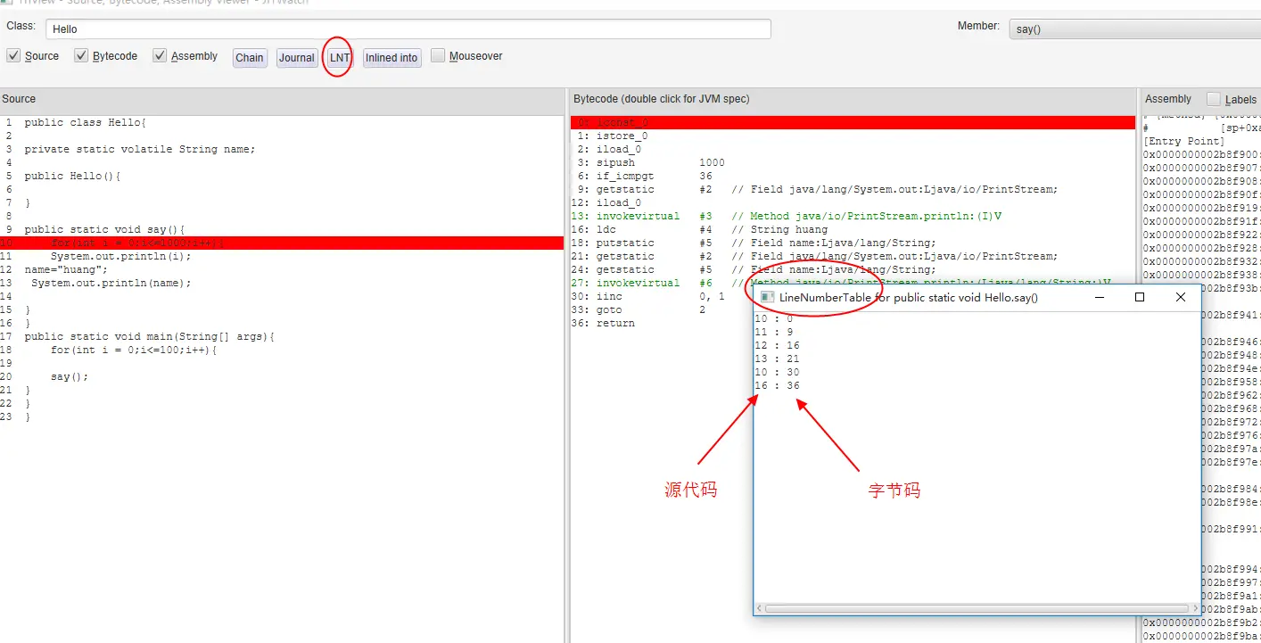 Java字节码文件中有一个叫做行号表的属性,存在于Code属性中, 它建立了字节码偏移量到源代码行号之间的联系。我们可以点击LNT按钮,进行调试:
