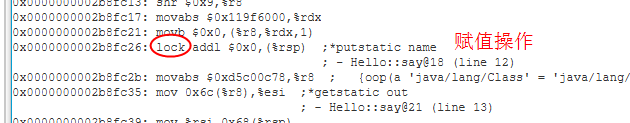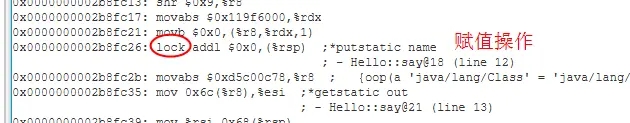 还记得最开始我们讨论的volatile底层汇编代码lock指令吗?查看我们的汇编代码可以发现有这么一行代码: