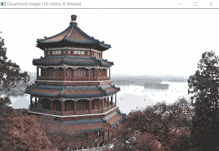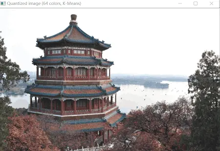 本例使用了一幅颐和园的彩色照片,原图具有96615种颜色,使用K-means找到n(n=64,32,16)个聚类中心作为n种颜色,再根据所有点与聚类中心的距离大小确定其属于哪一个聚类中心。