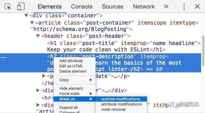 基本上大家都会用 JavaScript 的断点调试,但是应该很多人不知道 DOM 节点也可以进行断点调试。Chrome DevTools 提供了三种针对 DOM 元素的断点调试:子元素改变时、属性改变时 和 元素被移除时。