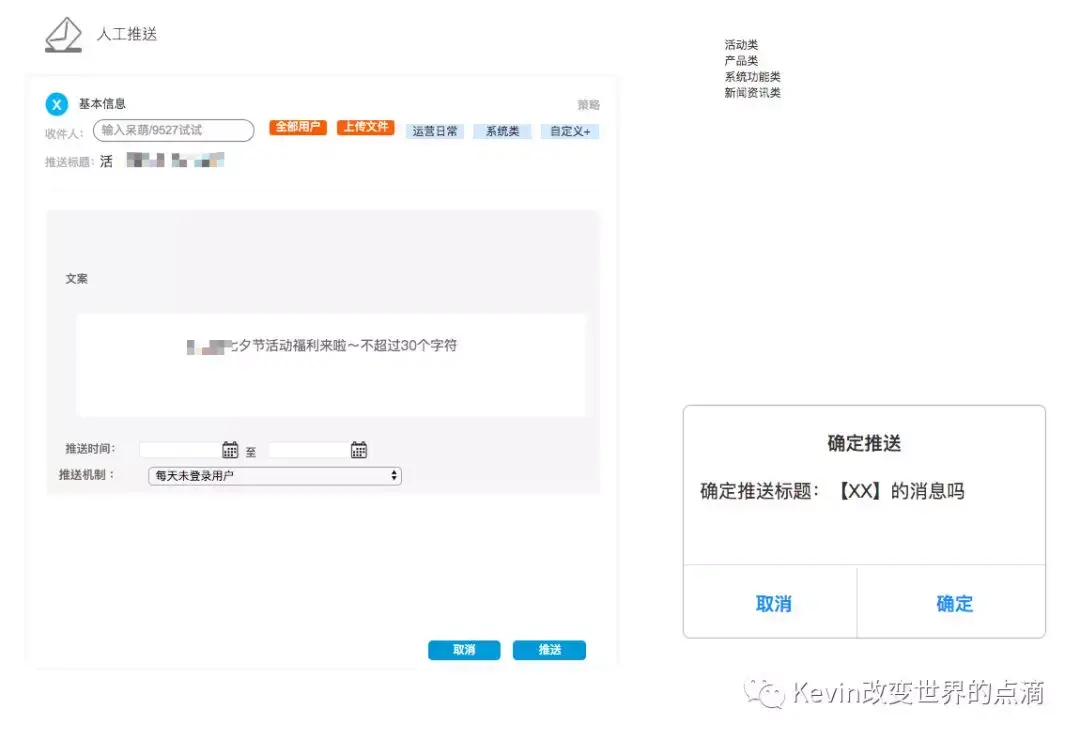 人工推送的目的是为了给予内部管理人员和运营人员作为工具的方式促活用户。但要注意的是,消息盒子要考虑审核机制。曾经出现过运营同学不小心将测试的消息发送给线上环境用户。