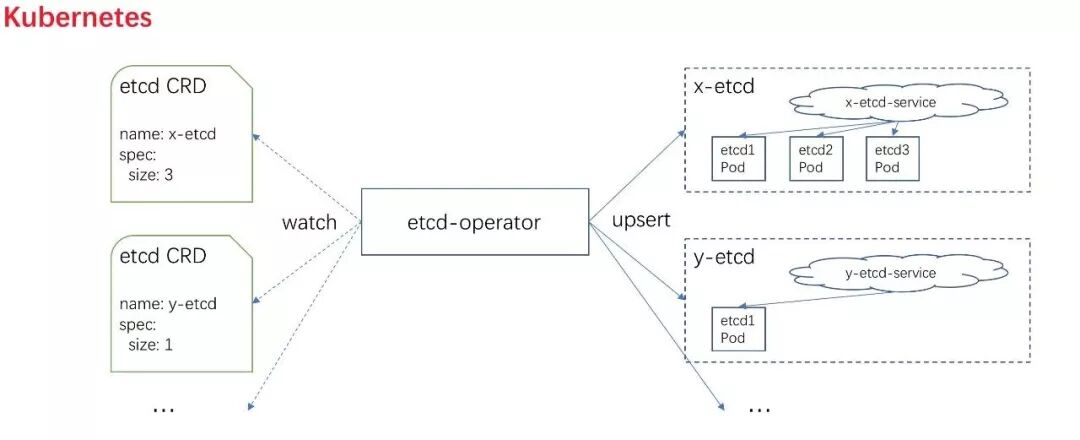 其中,上面的Spec.Size=5代表了我们需要一个由5个etcd节点组成的etcd集群。etcd-operator会根据上面的配置,初始化完成etcd集群。相应的,如果你又需要另一个3节点的etcd集群,你只需要提交新的一个Spec.Size=3的CRD Resource即可。