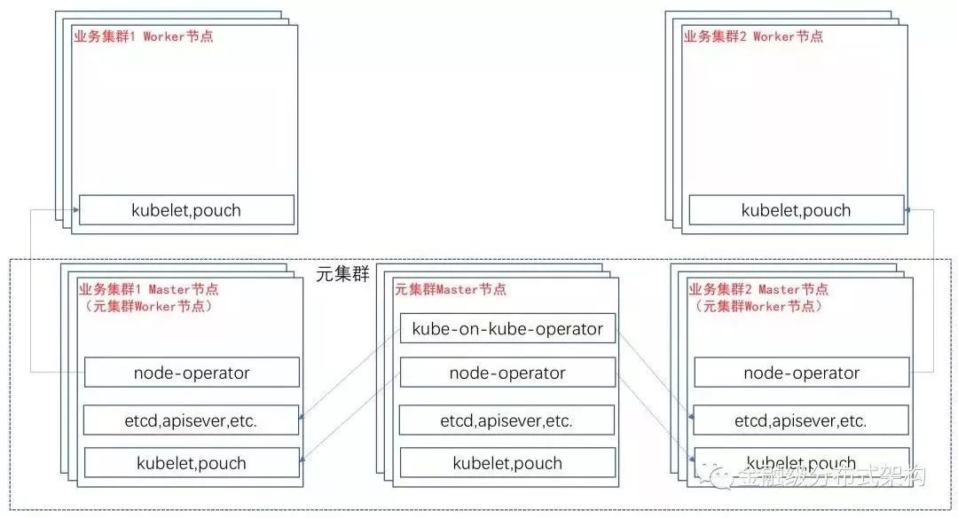 1 Kube-on-Kube-OperatorKube-on-Kube-Operator用于Watch Cluster CRD Resource的变更,将“Cluster”所描述表示的Kubernetes业务集群的所有Master组件达到最终状态。如下图,是“元集群”和它所管理的两个“Kubernetes 业务集群”的最终状态: