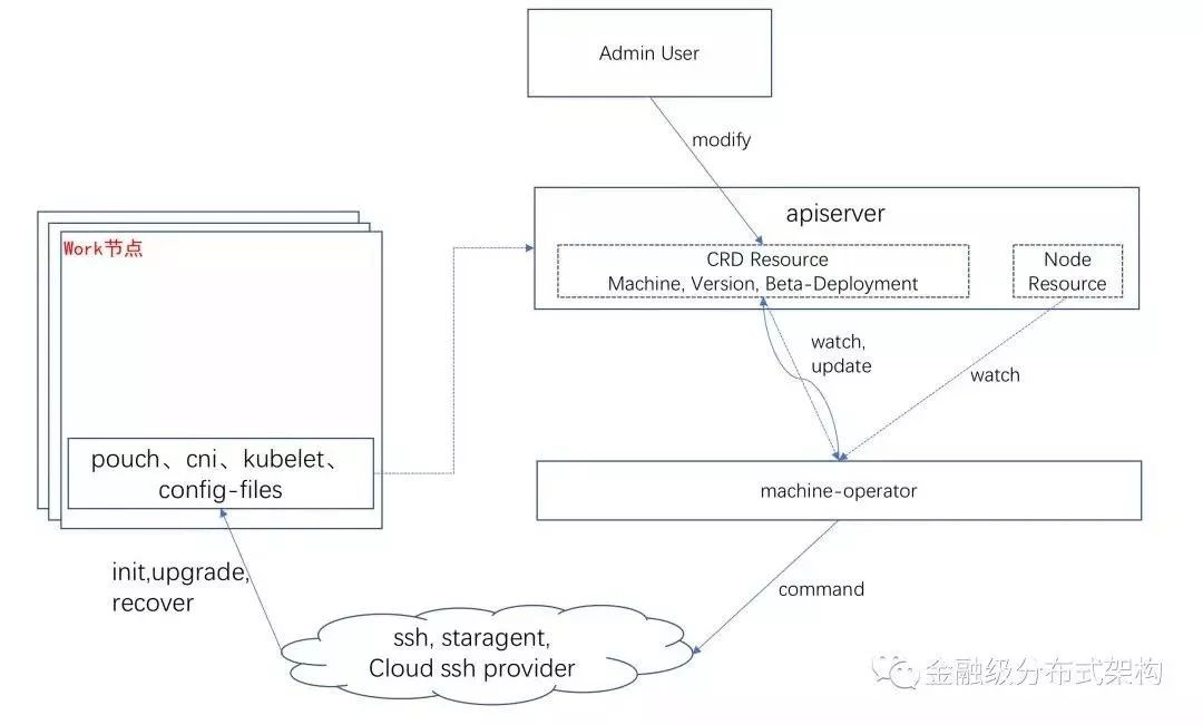 2 Node-OperatorNode-Operator用于Watch Machine CRD Resource的变更,将“Machine”所描述表示的Worker节点上的on-host软件(docker、kubelet、cni)达到最终态,最终能让“Machine”所对应的“Node”在Kubernetes集群中达到“Ready”状态。架构图如下: