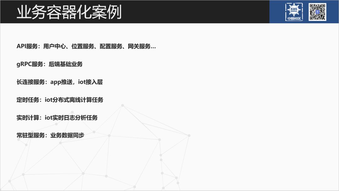 我们的一些容器化案例:API 业务基本无状态,对接 APP 端。有用户中心、位置服务、配置服务还有一些网关服务等。基于 node/go 开发,内部会使用 gRPC 方式访问底层依赖服务。