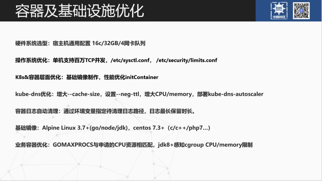 我们包括基础镜像的制作(本地化,如东八区时区)。性能优化方面,我们把容器内的优化脚本也打包到了基础镜像中,便于 initContainers 阶段执行。运行 go/node/java 业务的基础镜像是基于 Alpine Linux3.7、3.8 定制。