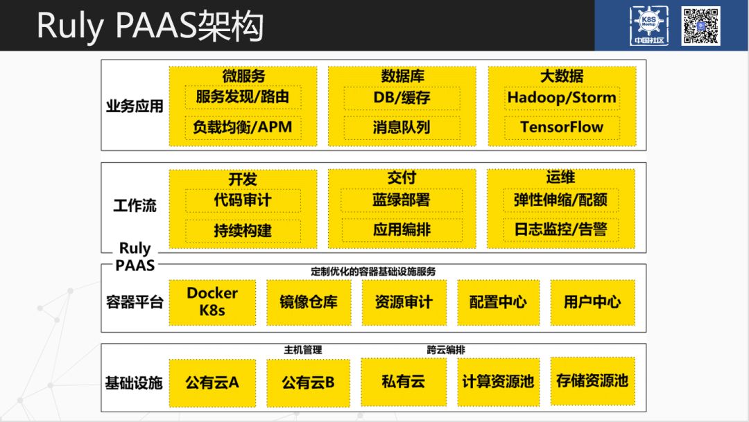 我们目前并行在做自有 IDC 机房的容器基础设施适配工作。上层工作流层,主要是 CI/CD 功能部分,是 Ruly PaaS 的主要功能模块。代码审计功能主要是集成了 SonarQube 作业务代码扫描。持续交付,默认 Kubernetes Rolling Update 方式。