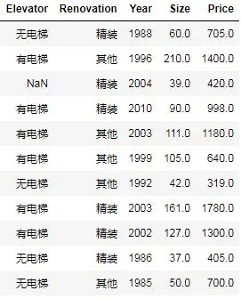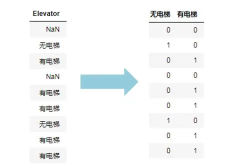 可以看到,图中的Elevator和Renovation都是定类型数据。除去缺失值,Elevator分类有电梯和无电梯两种。Renovation分为有精装,简装,毛坯和其它四种。下面,我们要对Elevator这个变量进行编码,在pandas中有现成的独热编码方法get_dummy,代码如下: