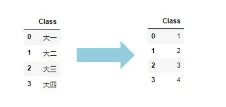 Class特征是定序数据类型,也是分类类型,但比定类更高级,因为有排序。Label encoding就是对特征值进行自定义式的标签编码。比如将大一变为1,大二变为2,大三为3,大四为4。那么经过编码后,特征值将变为以下的样子:
