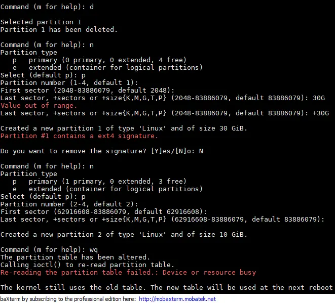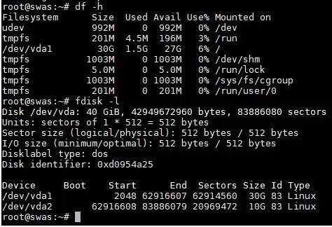 9. fdisk /dev/vda # 用fdisk删除vda1分区,再新建30GB的vda1分区和10GB容量的vda2分区