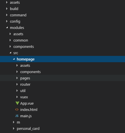 我们先看最主要的修改,即添加了modules文件夹,modules下的src文件夹下就是所有模块了,多个模块有共享的assets和components,各个模块也有各自的assets和components。通过对比,我们可以知道,其实就是将vue-cli的src下单个模块划分成为多个模块。当然,各个模块如果你想按照原来vue-cli产生的模式进行开发也是可以的,各个模块可大可小,不过建议各个模块不要太大,不然分模块的意义就不大了。
