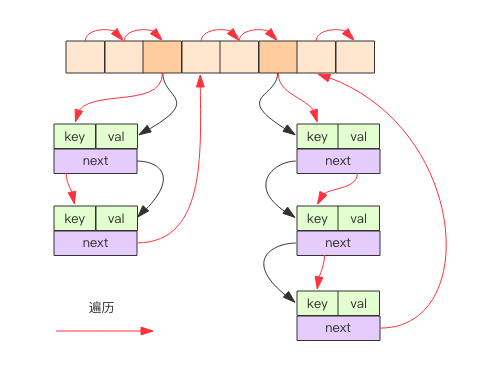 // 试想如果后面发生了rehash,当前遍历的链表被打散了,会发生什么