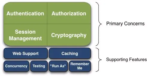 Authentication(身份鉴别)、Authorization(权限管理)、Session Management(会话管理)、Cryptography(加密)