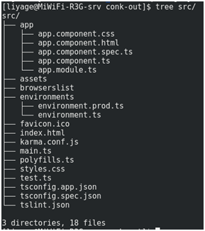 我们的项目代码包括angular的组件,模版,样式文件,图片还有其他我们自己写的都集中在src里,这个跟java是一样的,这个目录以外的一些目录和文件则是帮助我们构建项目用的,所以可以暂时不用管它.可以使用treesrc/命令以树的形式展示出src目录下的所有目录及文件,如下图所示: