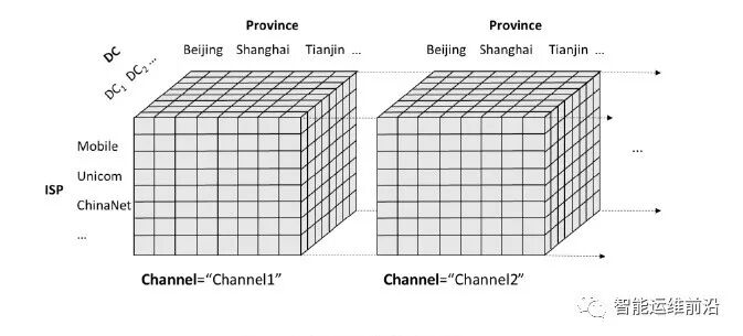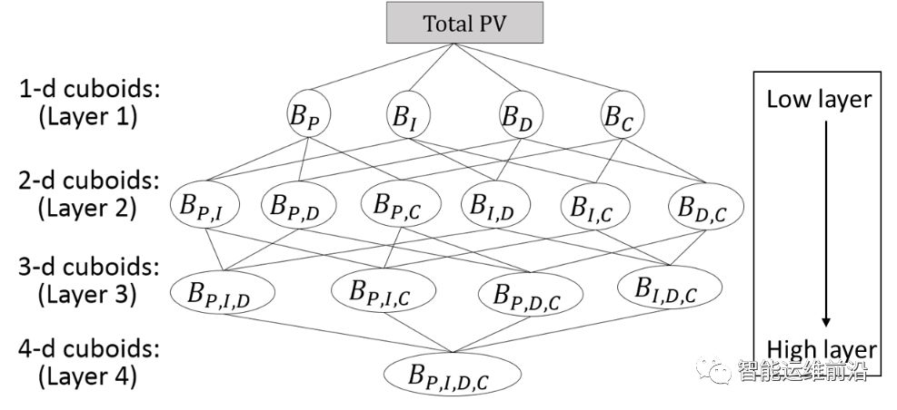 对于网络运维中多数的关键性能指标(KPI,CPU利用率、某页面点击量等),对其应用实时的异常检测算法,即可快速发现异常状况、进而及时止损,然而,有一类可加和的多维度KPI体系(如网页访问量PV、收入指标、错误计数等),其指标元素数目繁多、之间具有复杂的相互影响关系。如图 1表示一个4维的PV指标体系(由一系列3维的结构来表示),维度是Province,ISP,DC和Channel(简记为P,I,D,C),其中每个cell表示一个最细粒度的指标元素对应的PV值,例如v(Beijing, ChinaNet, DC1,Channel1),相应的也有较粗粒度的元素,例如v(Beijing, ChinaNet, DC1,*)、v(Beijing, ChinaNet, *,*)、v(Beijing, *, DC1,*)、v(*, *, *,Channel1)、v(*,*,*,*),分别对应一排cell、一个平面的cell、一个立方体的cell、总PV。这种数据结构称为data cube,其中的子cube称为cuboid (用Bi表示),图 1 中的4维data cube,其中包含若干cuboid,结构可如图 2所示。