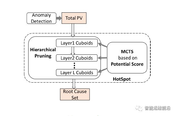 HotSpot概览见图 2,它将问题转化为在一个巨大空间的搜索问题后,应用 MCTS 作为基础搜索算法,并且提出了一个根因可能性评分指标,作为每个集合的度量和 MCTS 中的价值函数; 此外,HotSpot还采用分层剪枝的方法以进一步降低搜索复杂度(逐层搜索,利用前一层的结果对该层先做剪枝)。