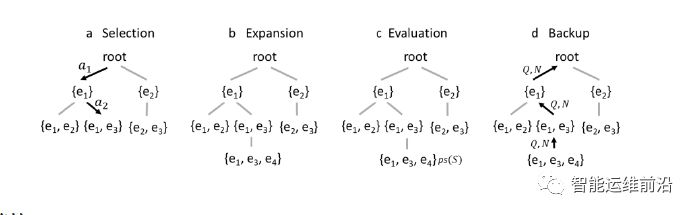 如前所述,本文将多维度指标体系中的异常定位问题转化为搜索问题,其中主要挑战是搜索空间太大。而一些围棋程序,如AlphaGo,要解决的主要问题之一也是搜索空间太大,他们常用的是MCTS的方法。受此启发,本文也采用了MCTS搜索的方法。基本原理简述如下,围棋程序中需要决策下一步的落子位置,对于一个待测位置要判断其落子胜率,可以通过模拟尽可能多的结果来评估,最后选择一个胜率最大的位置落子;类似地,本文中需要决策根因集合中是否添加下一个元素,与胜率相对应,本文也提出了判断一个集合是根因可能性的分数Potential Score (也是对挑战一的解决方案)。