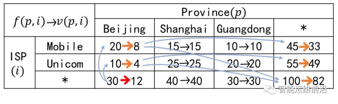 本文从实际案例中总结出一个元素之间互相影响的规则,Ripple effect。该规则旨在说明,任何一个元素值变化时,最细粒度层次中它的后代节点值将按照一定比例(通常是相同比例)进行变化;因体系的可加和性,有了最细粒度元素值,即可推导出其他所有元素值。例如 表 1中箭头所示,(Beijing,*)是根因,其最细粒度子节点 (Beijing,Mobile)和(Beijing,Unicom)会等比例降低(这里是理想情况,实际中存在噪声等影响),进而可推导出其他相关的值。