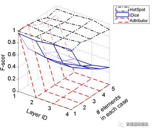 本文对比了HotSpot和另外两种算法在本文场景下的结果,另外两种算法是Adtributor (NSDI 2014)和iDice (ICSE 2016,也是上篇公众号文章)。图4展示了三种算法的F-score值,发现HotSpot在所有20类异常实例中都获得了更高的F-score值;随着根因集合中元素数量的增加,iDice的F-score急剧下降;而Adtributor只有在第一层的异常定位中达到了较好的准确性,其余层次中准确率降为0。相比之下,HotSpot在每种情况下的不同数量的元素和层次上都表现的相当好。此外,本实验在运行时间上,三个算法都在一分钟内,HotSpot略微落后另两种算法;不过,实际中HotSpot可以通过调节MCTS中的阈值来权衡准确性和运行效率。