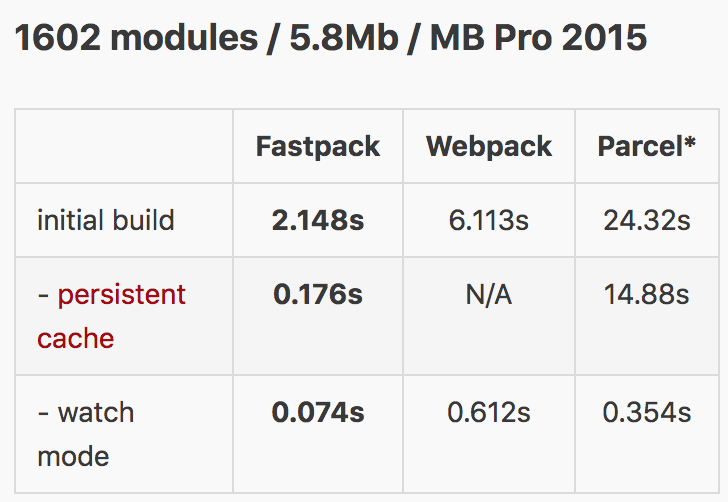 上个月,前端领域又诞生了一个新的“轮子” —— Fastpack,号称可以轻松快速打包 JavaScript 应用。它的目标是做到对于中型应用(约 1000 个模块)的打包时间小于 1000ms,增量重新打包时间低于 100ms。基准测试结果如下: