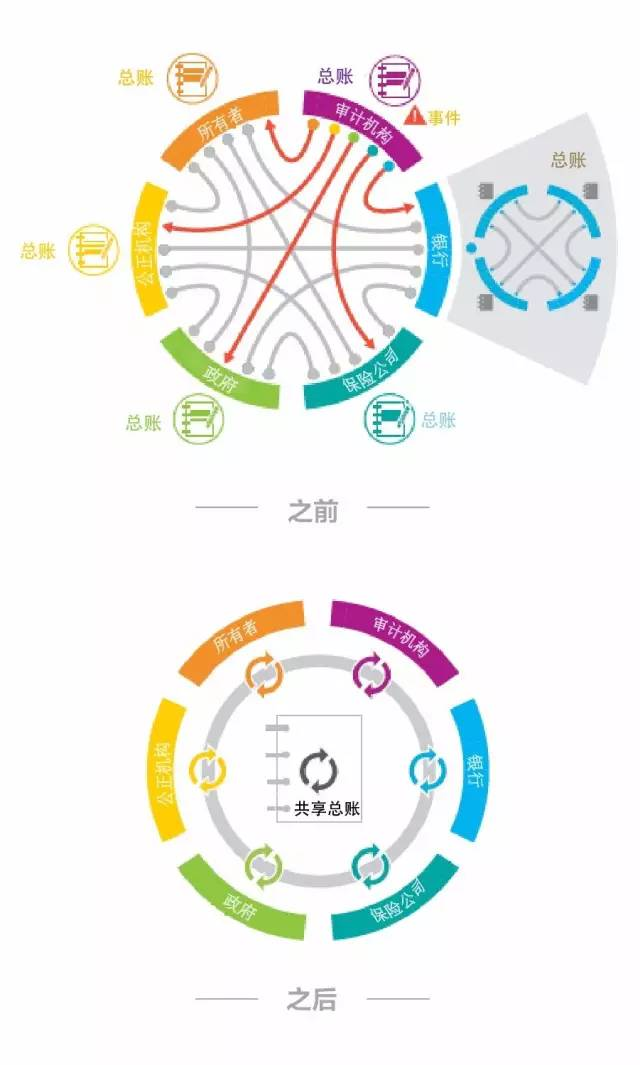 很多时候不是因为刻意去掉中心,而是真的没有中心,或者中心失败了,那么区块链就是可以解决没有中心的时候,重建信心,解决了交易成本和信心缺失的问题。参考IBM的例子。 见下图,当遇到需要共同分享数据的时候,需要达成共识的时候,多个互不信任的机构就需要一个共同账本,这就是区块链的应用所在,大家都要交易和记账,但是账本不在自己内部系统,而是共享。