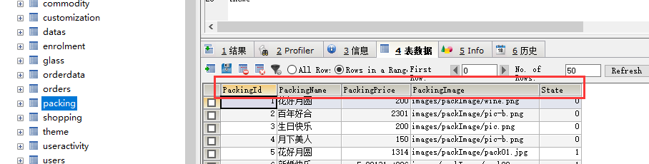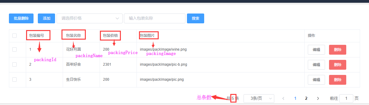 <template><el-table :data="packData" border style="width: 100%"><el-table-column type="selection" width="55"></el-table-column><el-table-column prop="PackingId" label="包装编号" width="120">//prop里的值是数据库表里的对应字段名</el-table-column><el-table-column prop="PackingName" label="包装名称" width="120"></el-table-column><el-table-column prop="PackingPrice" label="包装价格" width="120"></el-table-column><el-table-column prop="PackingImage" label="包装图片"></el-table-column></el-table></template></script>export default {name: 'pack',data() {return {packData:[],//主题数据}}methods:{// 获取 包装数据,因为搜索后分页数据会变化,所以这里可以传值到后台判断是否进行了搜索展示,这里只做简单展示,不考虑搜索和分页getPackData() {//我用的api代理this.$axios.post('/api/selectPackPageMade.do').then((res) => {this.packData = res.data;//把传回来数据赋给packData}).catch(function(error){console.log(error);})},}}</script>