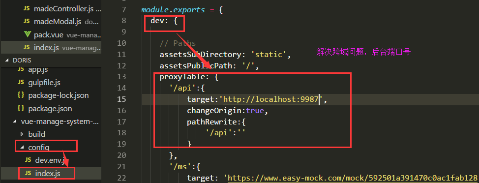 config里的index文件里的dev里面的proxyTable里面添加自己的后台端口,这样就能很方便的请求后台数据了
