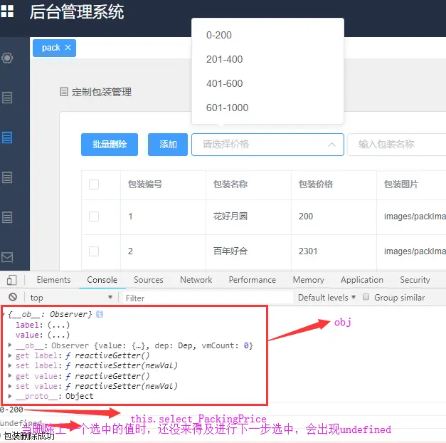 methods:{//选择下拉价格区间 changePriceValue(val){ let obj = {}; obj = this.options.find((item)=>{ return item.value === val;//比如:选项2 }); //判断是否有选择,如果用户没有选择,但是删除了上一个选择内容,避免控制台报错,需要做一个判断 if(obj!=""&&obj!=undefined){ this.select_PackingPrice= obj.label;//获取label的值 0-2000 console.log(this.select_PackingPrice) this.price=this.select_PackingPrice.split("-");//拆分label ["4001", "6000", __ob__: Observer] this.startPrice=this.price[0];//获取价格开始值0 this.endPrice=this.price[1]//获取价格结束的值2000 } }, }},</script>